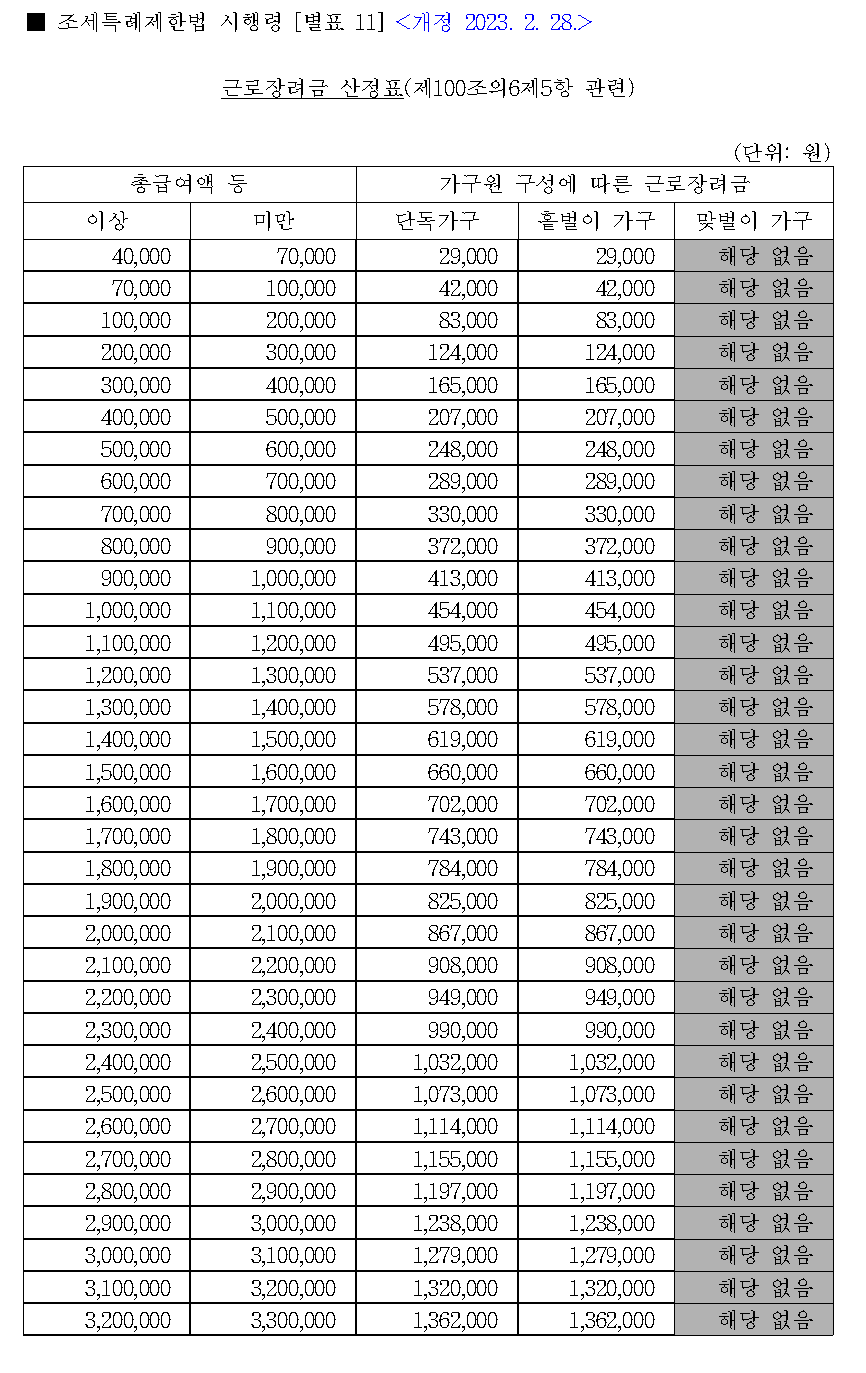 만약 400~900만원 사이의 가구원이 없다면 밑의 [근로장려금 산정표]로 자신의 총급여액에 해당되는 부분의 근로장려금을 확인하실 수 있습니다.  그리고 근로장려금의 액수가 많은 분이 신청하시면 되겠죠?