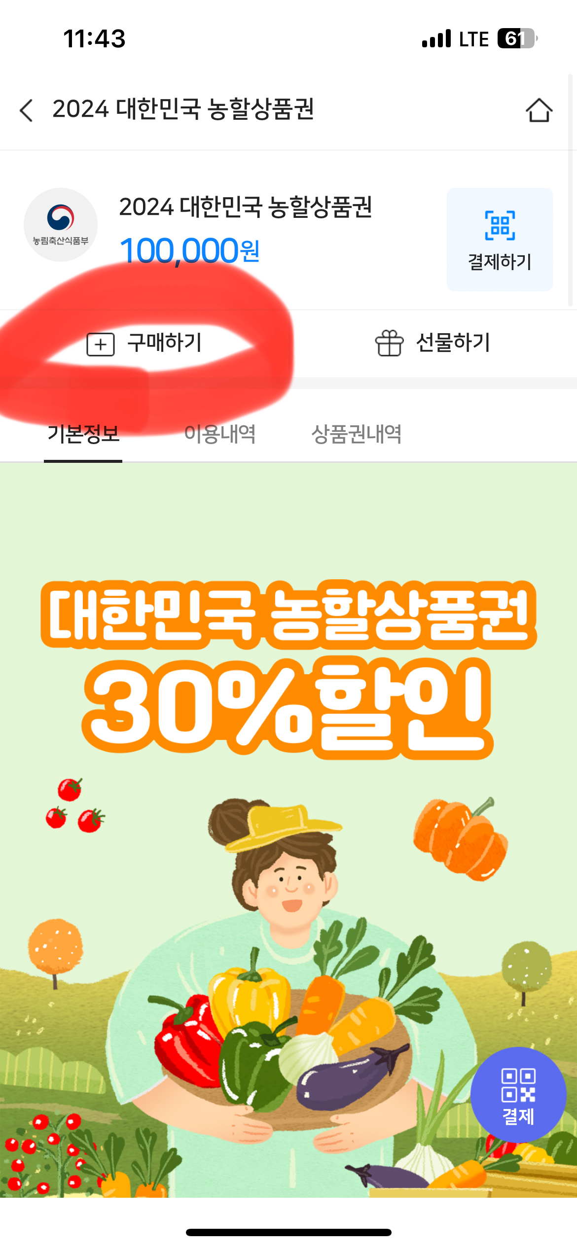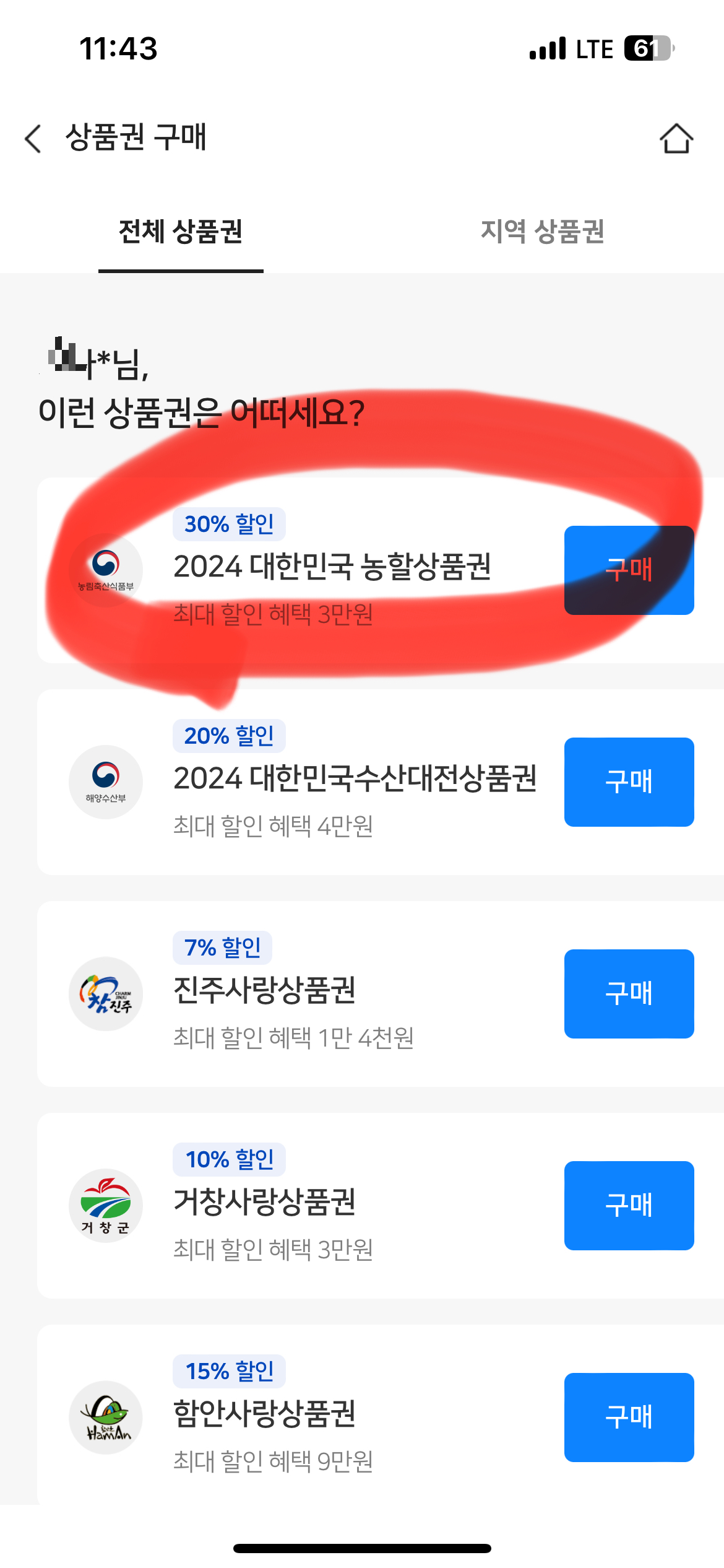4. 맨 위에 30% 할인 2024 대한민국 농할상품권 구매를 클릭해 주세요.