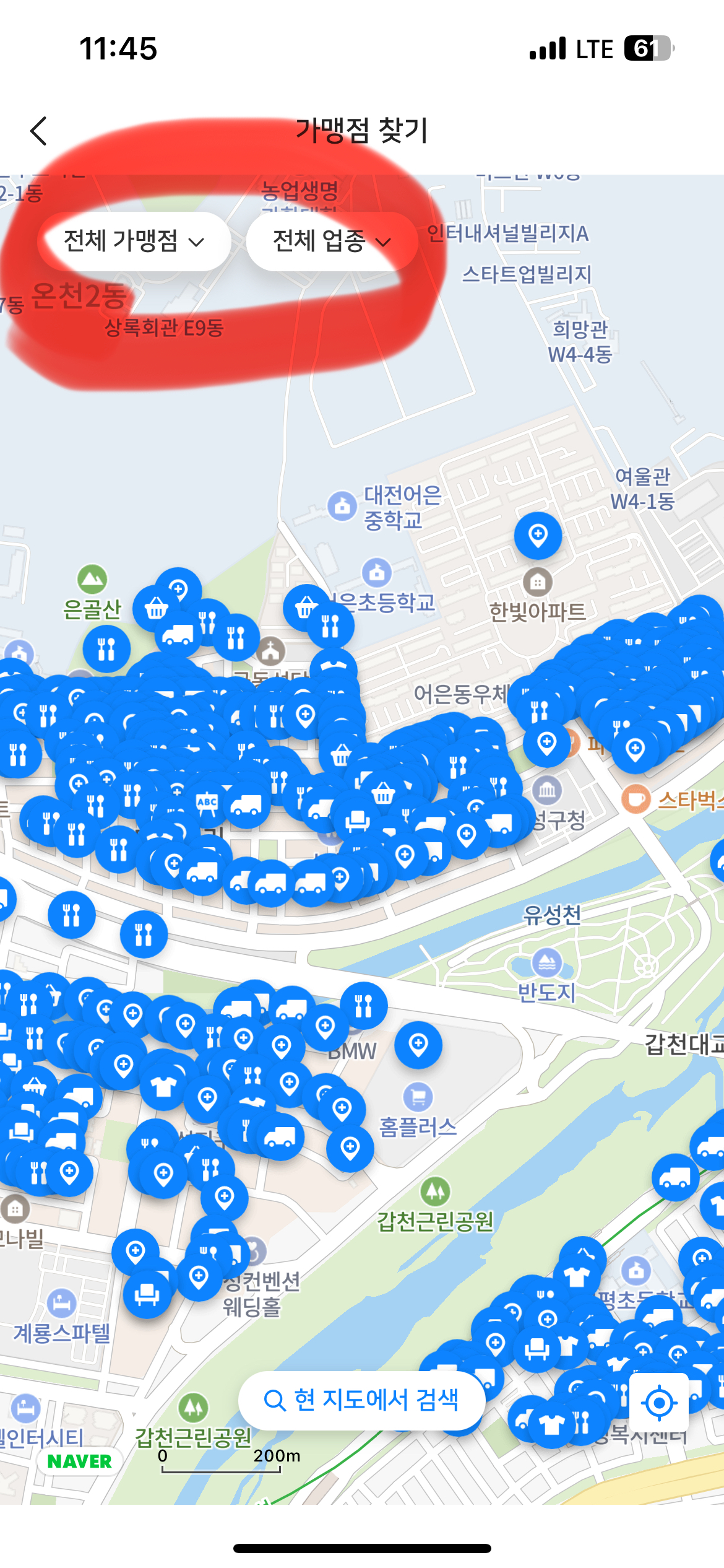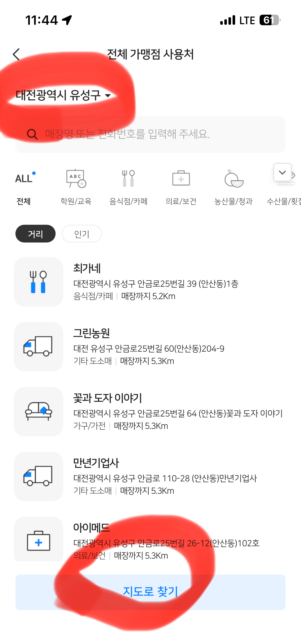 9. 원하는 주소를 선택 후 매장을 보시면 됩니다. 지도로 찾기를 누르시면 주변에 모든 가맹점을 볼 수 있습니다.