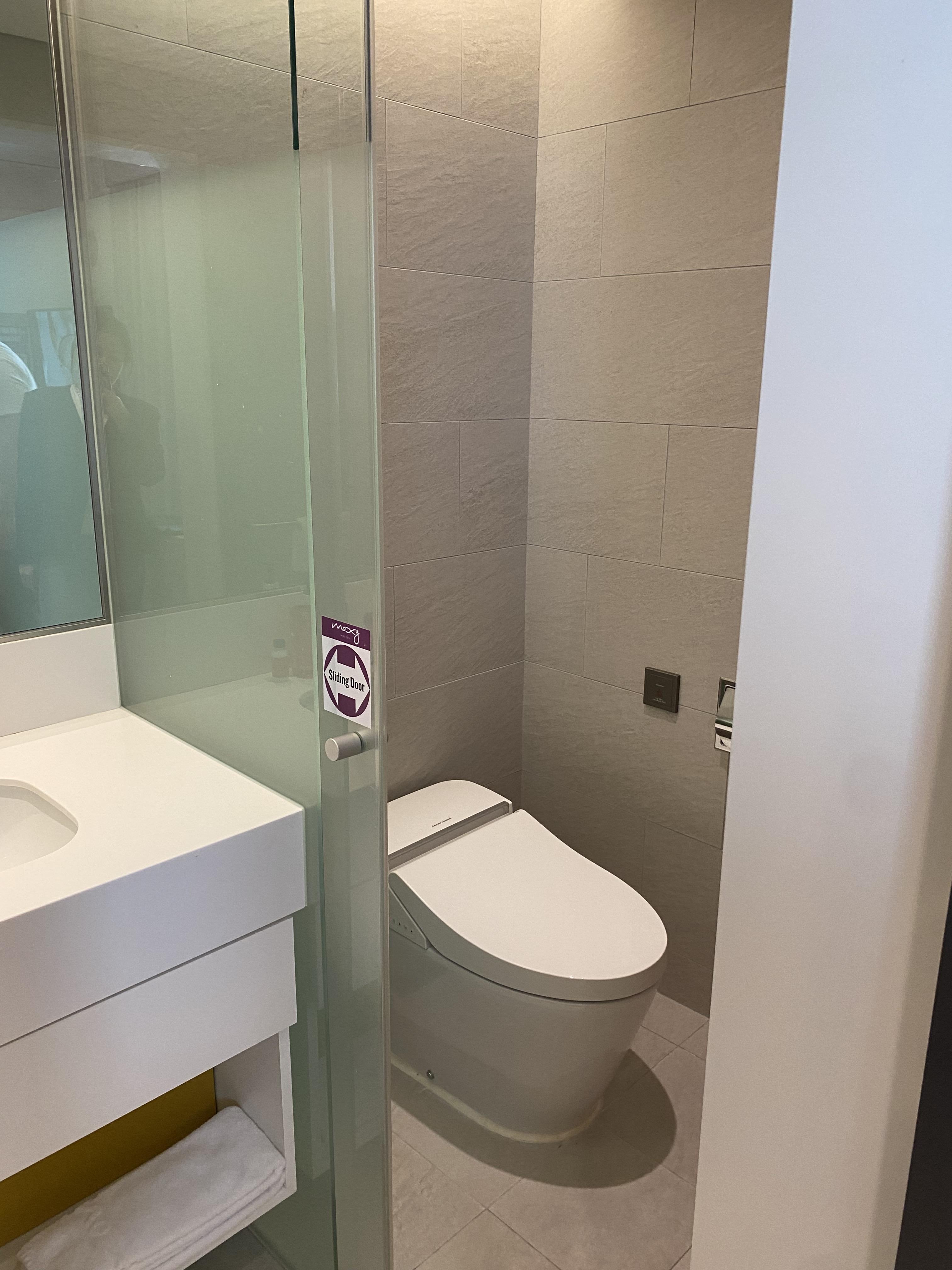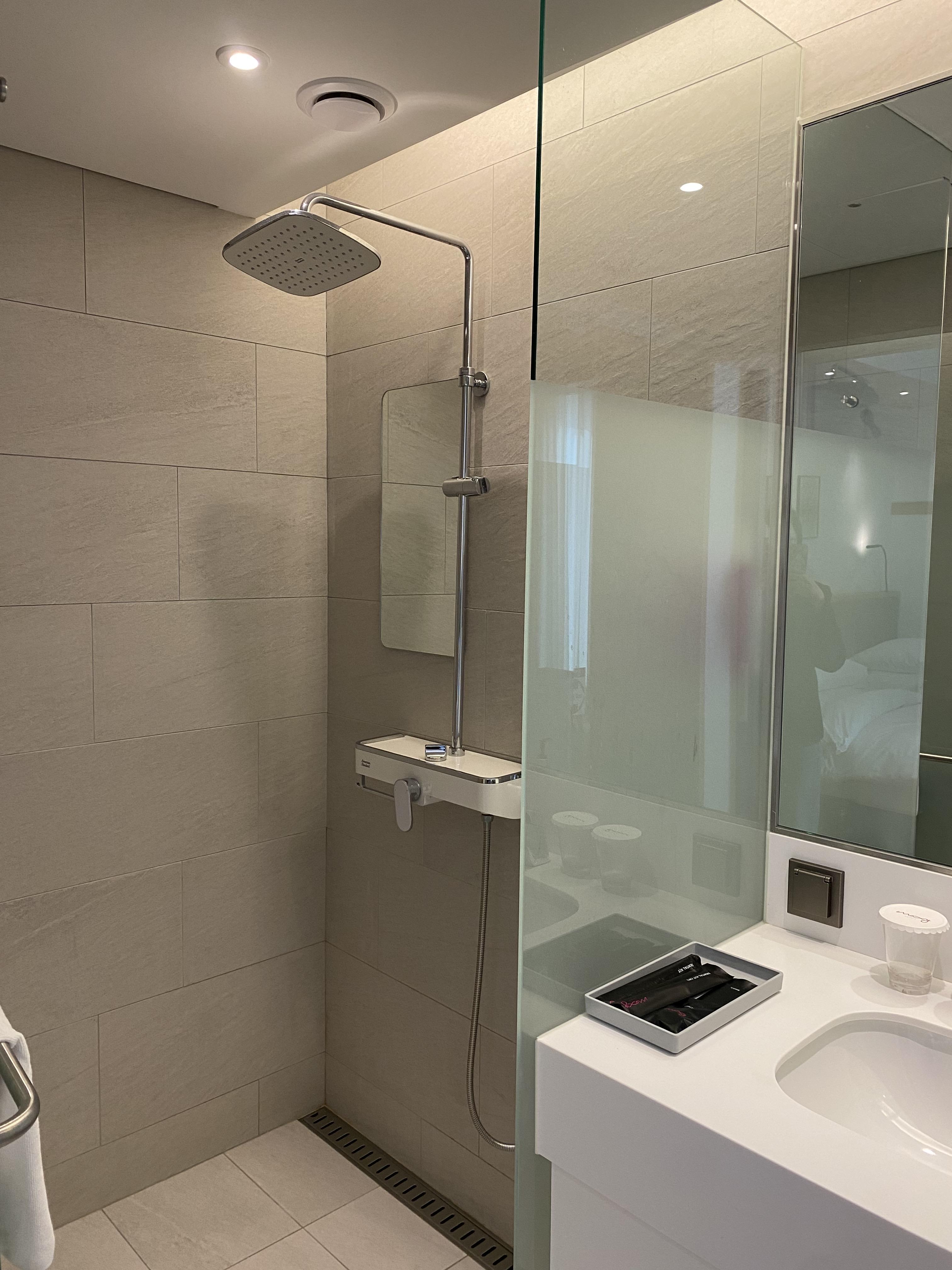 저는 호텔에서 샤워실과 변기가 구분되어 있는 것을 좋아하는데 목시는 세면대를 기준으로 양옆에 구분되어 있어서 좋았습니다. 바디워시, 샴푸, 린스는 벽에 펌프형으로 비치되어 있었어요. 3성급 호텔이라서 큰 기대는 안 했지만, 깨끗하고 필요한 것들이 다 구비되어 있는 가성비 호텔로 최고라는 생각이 들었어요.