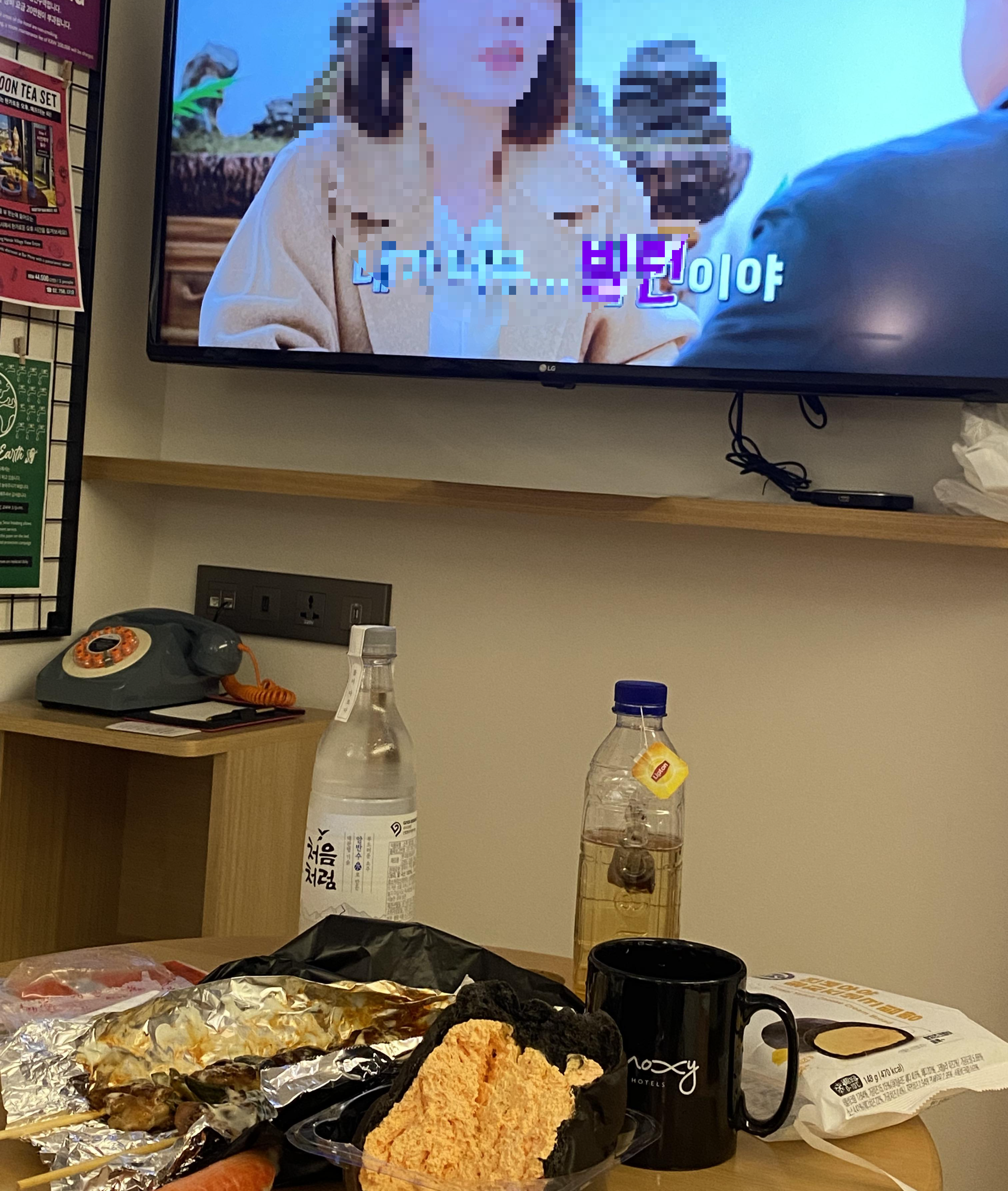 침대 앞에 TV와 탁자, 의자 그리고 커튼이 2중으로 되어있어 암막도 가능합니다. 저녁에 야식으로 소주 한잔과 닭꼬치, 황치즈 크림빵도 먹었습니다. 참고로 바로 앞이 포장마차 거리라서 야식의 유혹을 이기기가 힘들어요!