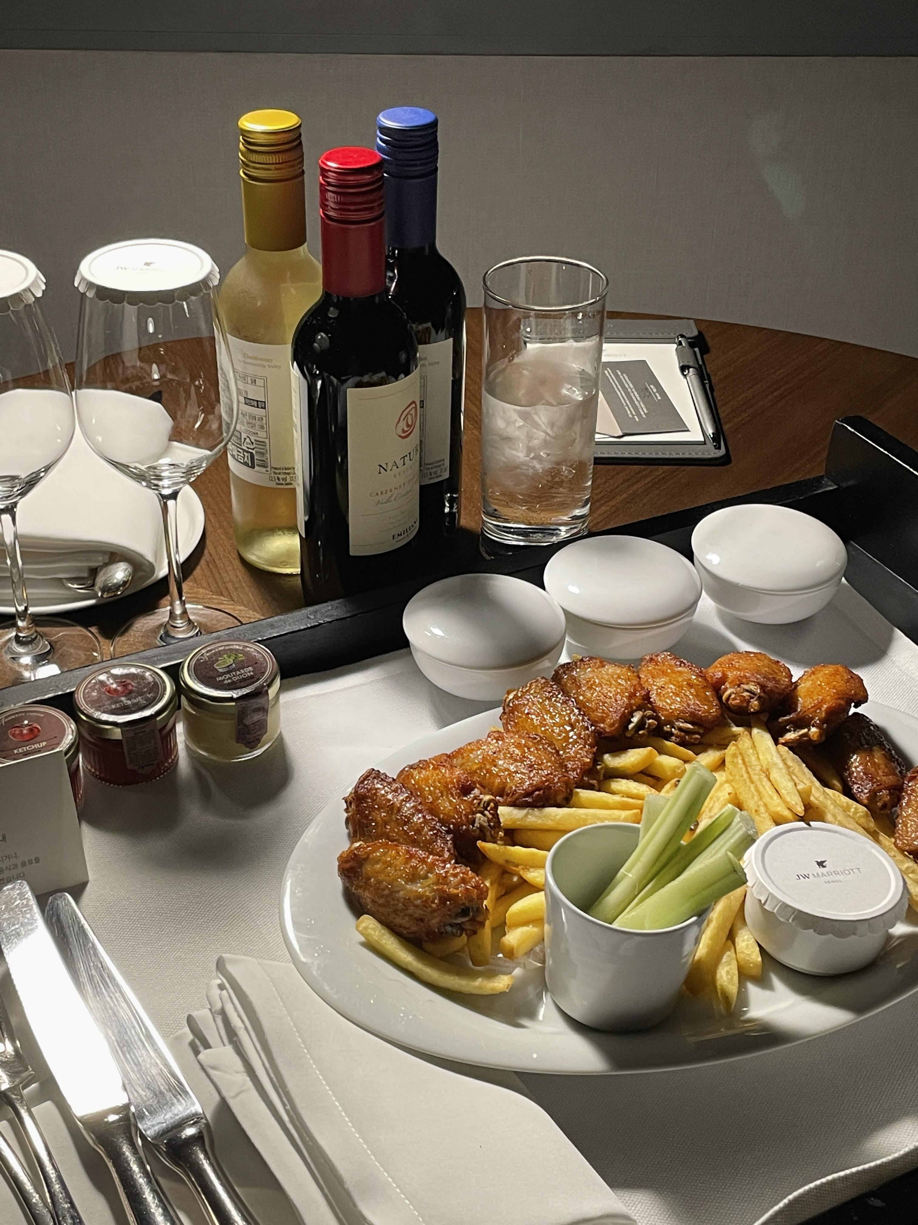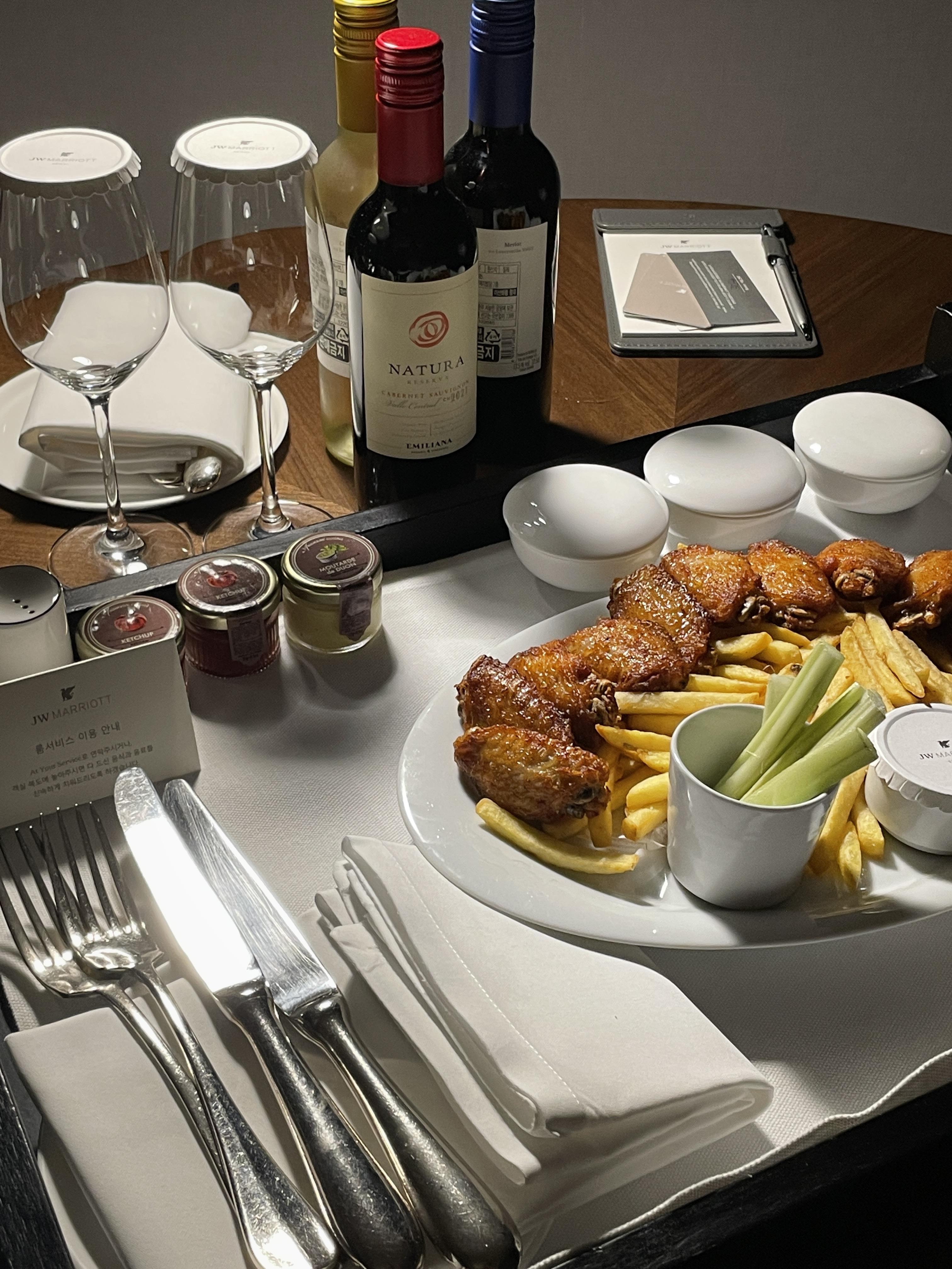 TV 보면서 간단히 먹을 윙 시켰어요. 갓 튀긴 감자튀김이랑 윙이 바삭하고 맛있었습니다. 분위기도 낼 겸 간단히 술 준비하고 얼음도 부탁드려서 시원하게 먹었습니다. 셀러리는 입맛에 안 맞아서 못 먹었습니다. 가격도 비싸지 않고 맛있어서 생각보다 만족한 야식이었습니다! 룸서비스시키실 거면 윙과 감자튀김 추천드립니다.