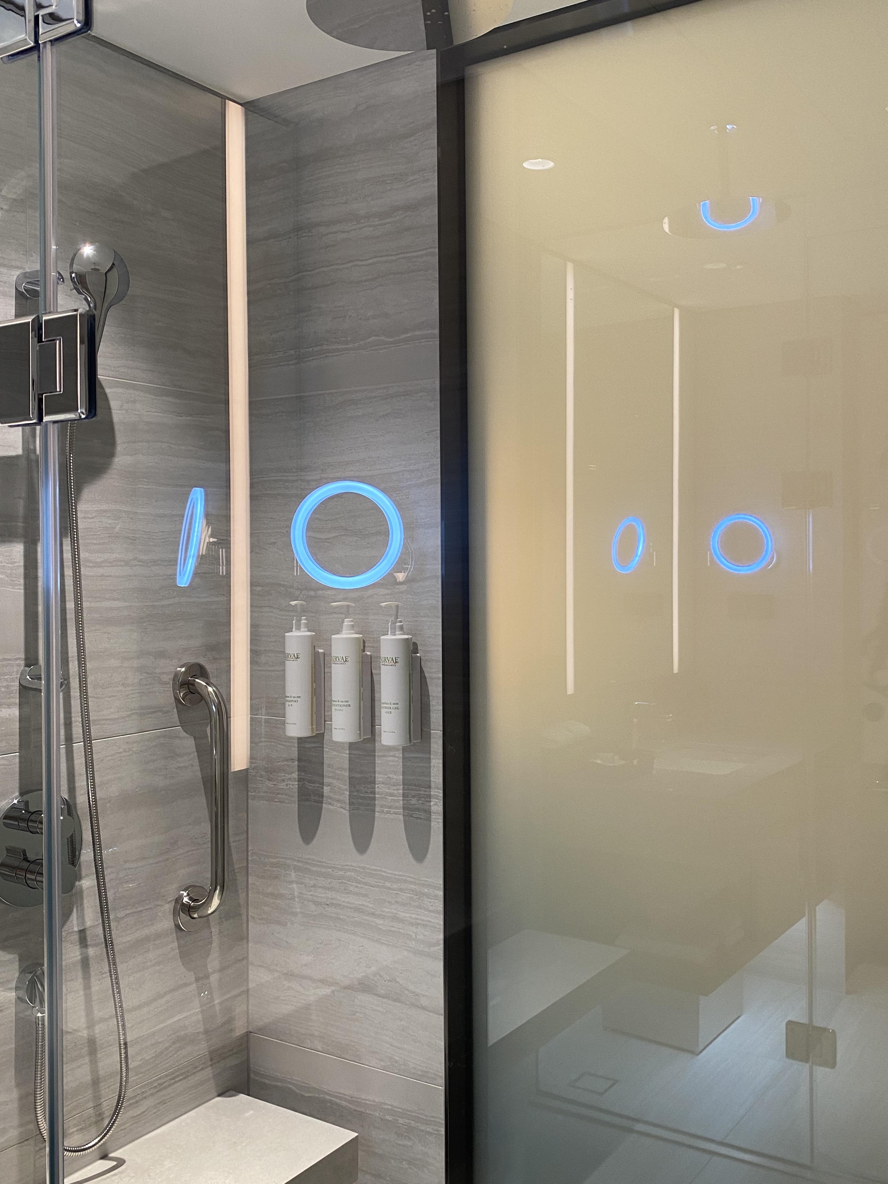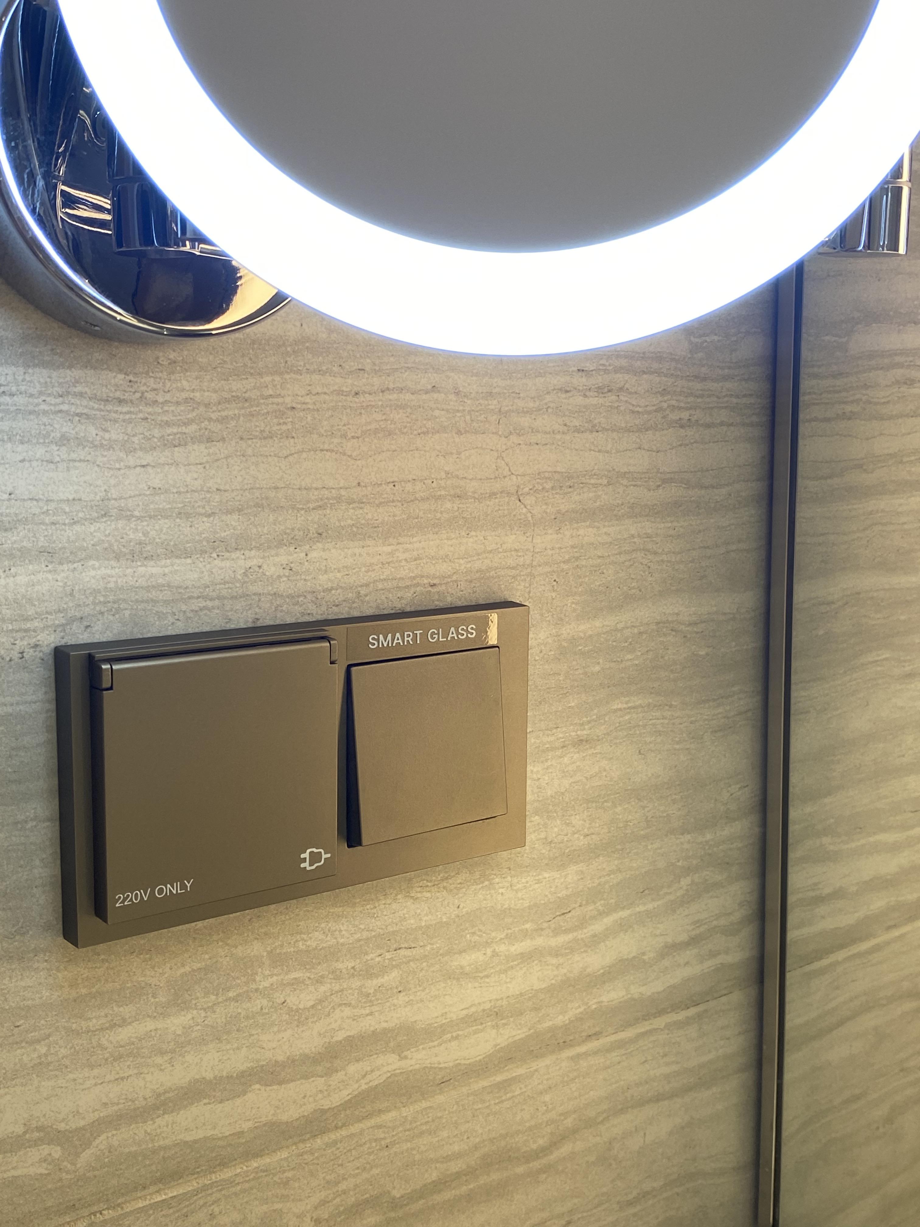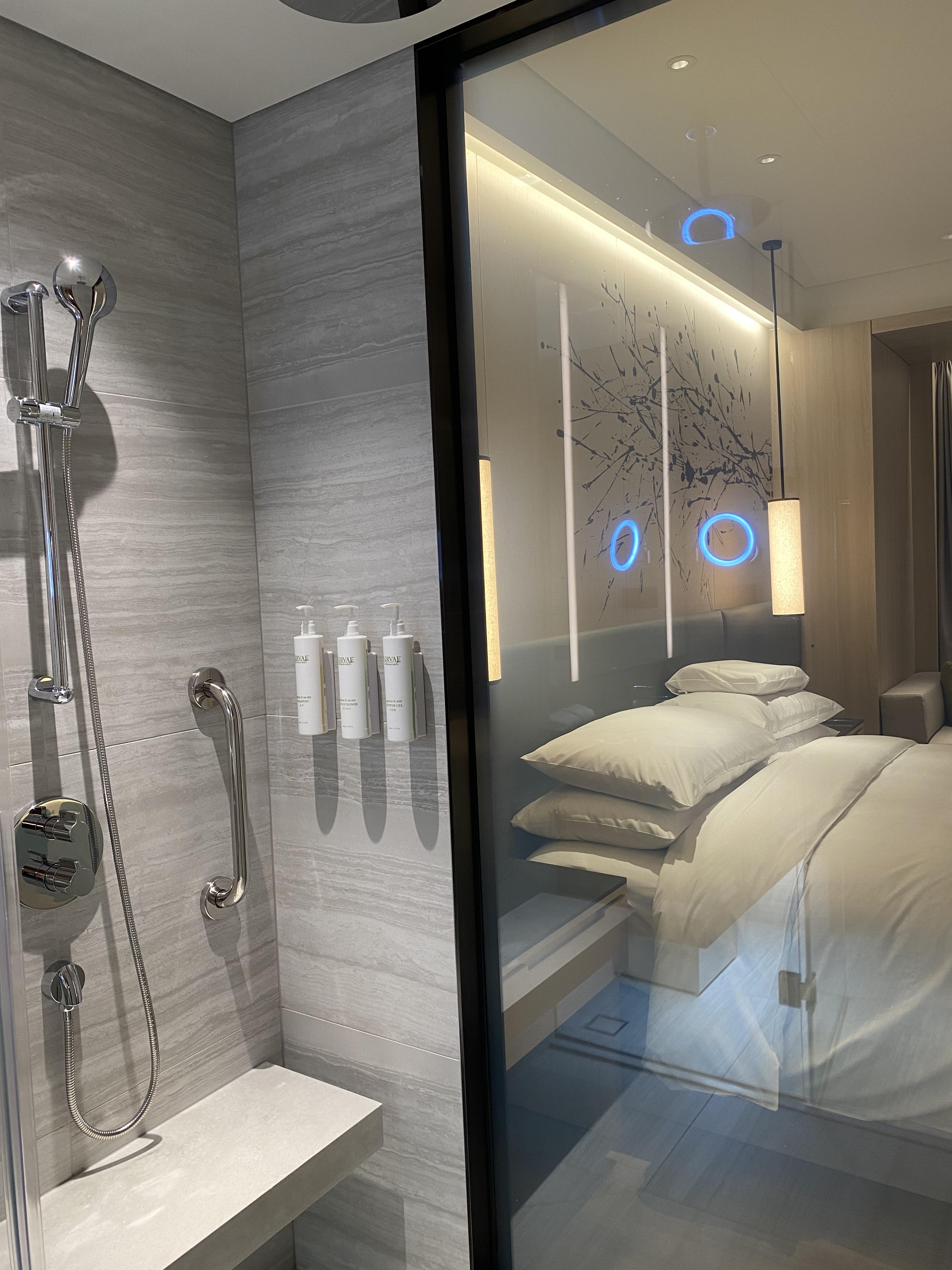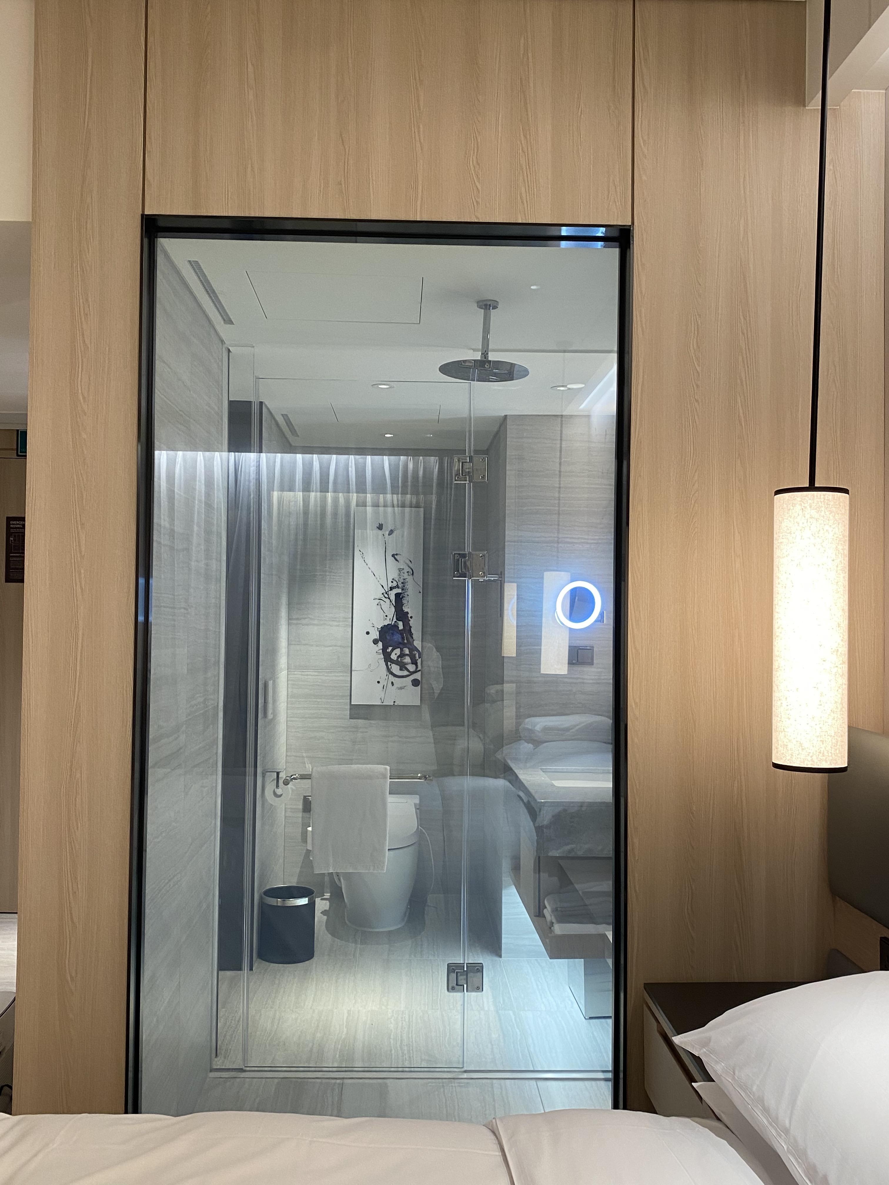 통유리 샤워부스가 조금 부담스러워 보였지만 스마트 글라스가 장착되어 밖에서 보이지 않도록 설정할 수 있습니다.