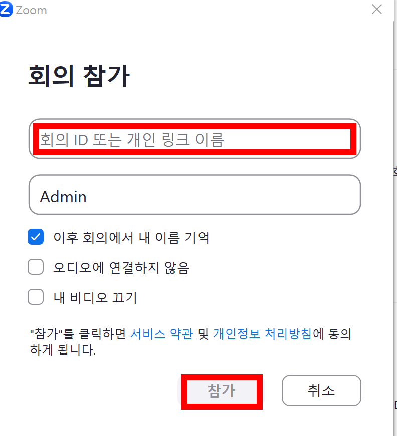 14. 초대주소나, 아이디를 미리 받으셨으면 회의참가를 눌러주시고 아이디나, 개인링크 (주소)를 입력하고 참가를 눌러주세요.