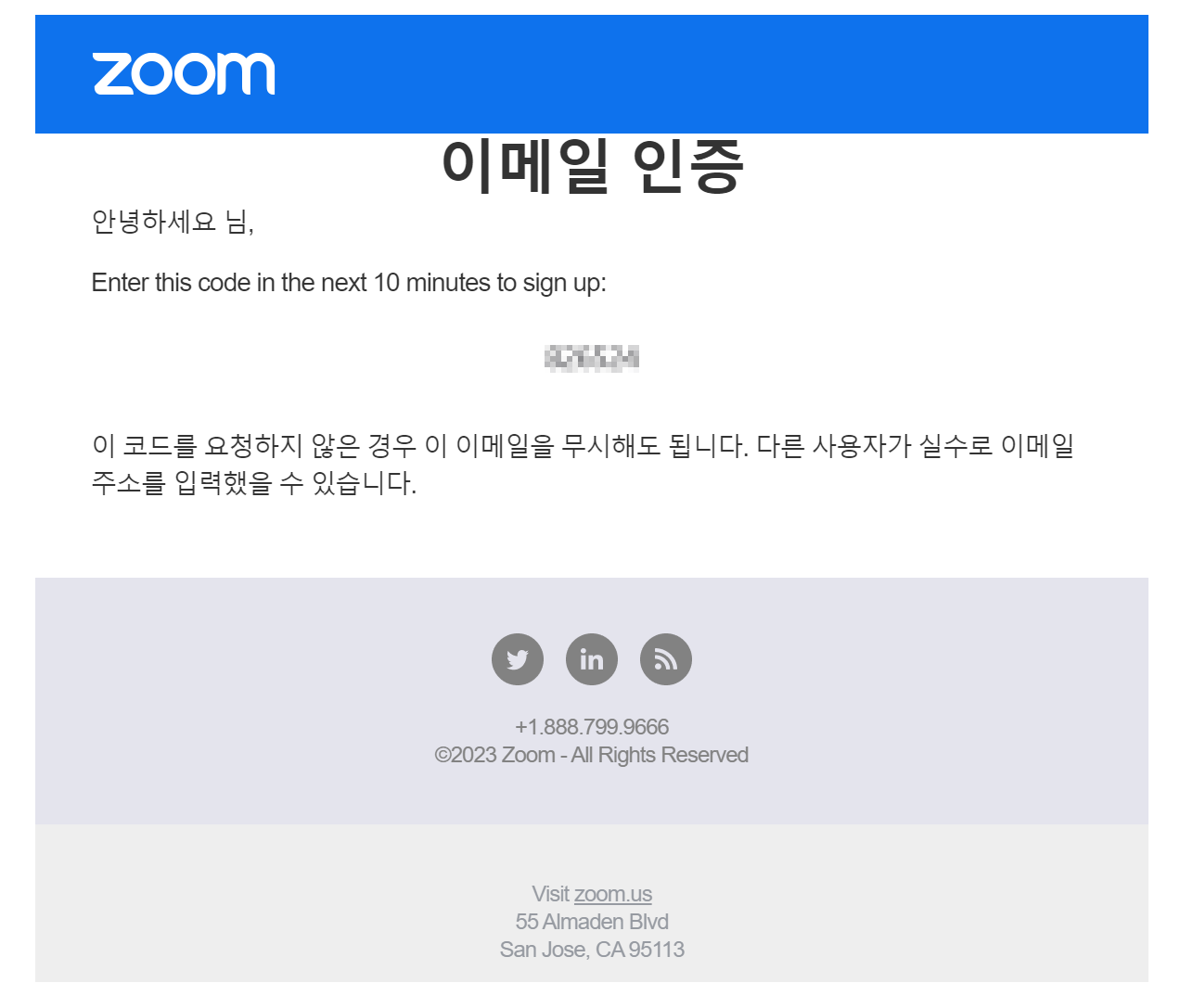 6. 계속 버튼을 누르면 코드확인 창이 뜹니다. 입력한 이메일로 들어가서 메일로 온 인증번호 6자리 숫자를 입력해 주세요. 오른쪽 사진처럼 인증번호 6자리가 써 있는 메일이 와있을 것입니다.