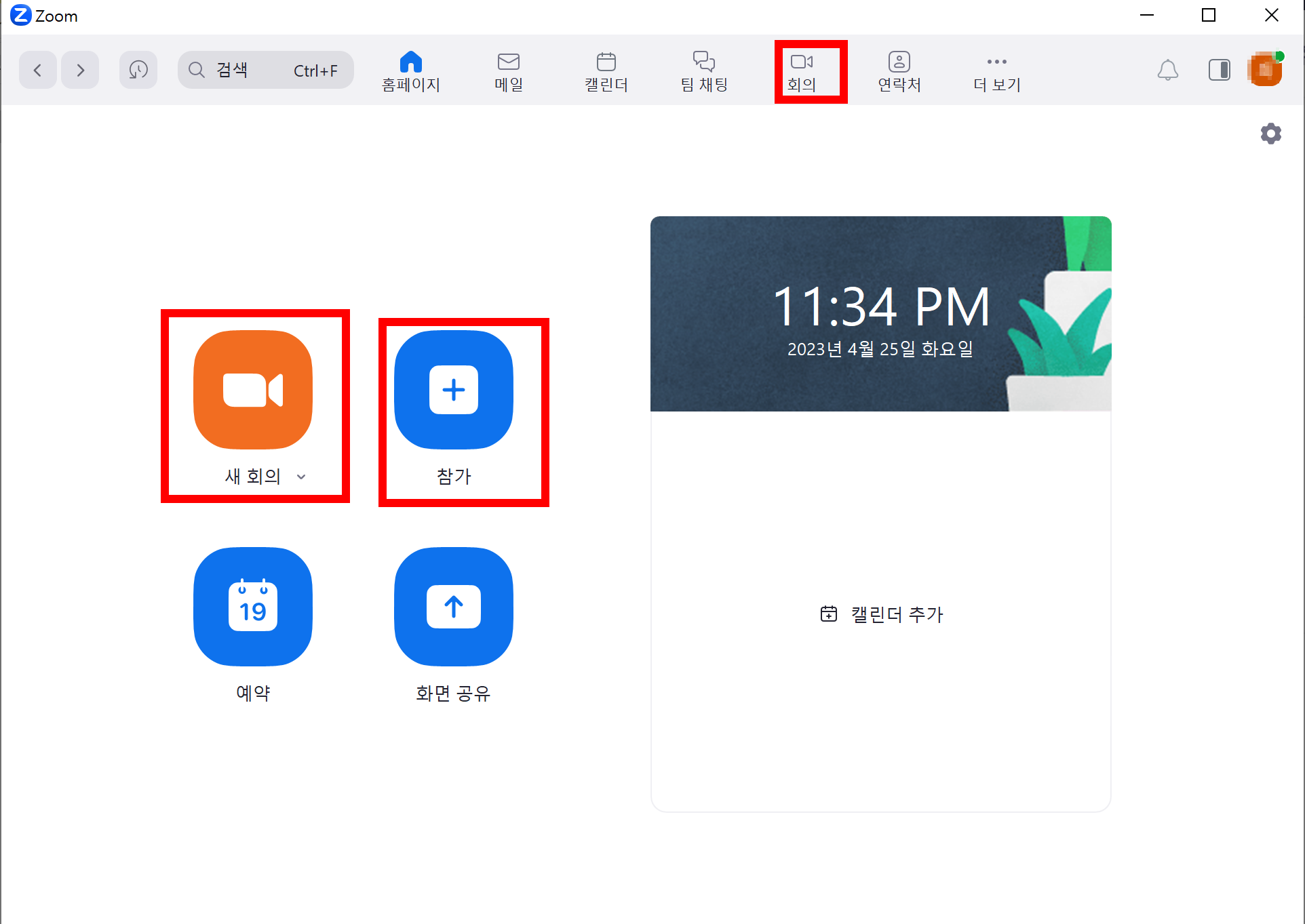 16. 로그인을 하면 이런 화면이 뜨는데요. 여기서 새 회의를 만들 수도 있고, 참가할 수도 있습니다.