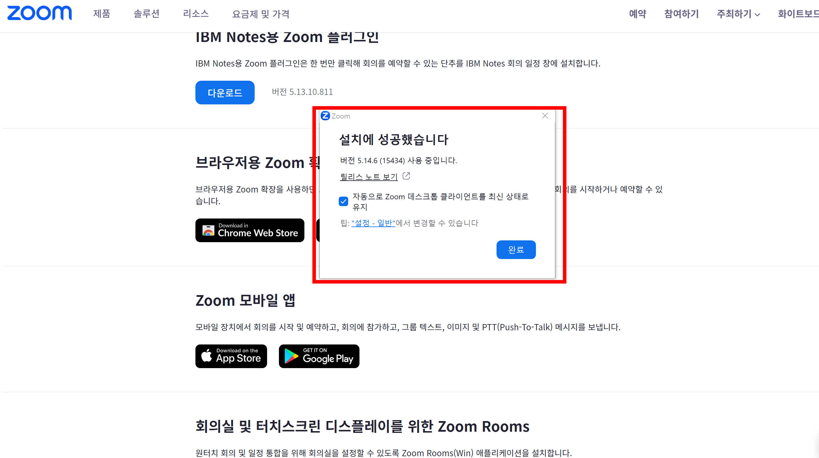 12. 완료가 되면 설치에 성공했다는 메시지와 함께 자동으로 zoom 데스크톱 클라이언트를 최신상태로 유지한다는 선택사항이 나옵니다. 선택사항이지만 체크를 하고, 완료를 눌러주겠습니다.