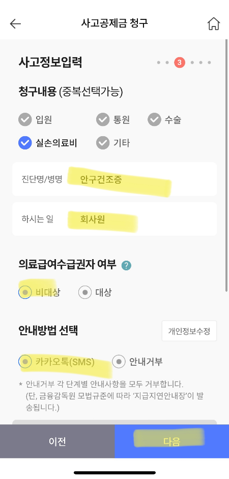 6. 약관에 동의 후 사고 정보 입력항목을 채운 후 다음을 클릭하세요.