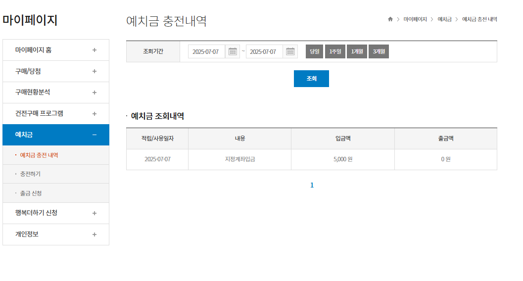5000원을 입금 후에는 예치금 조회내역에서 입금액을 확인할 수 있습니다.