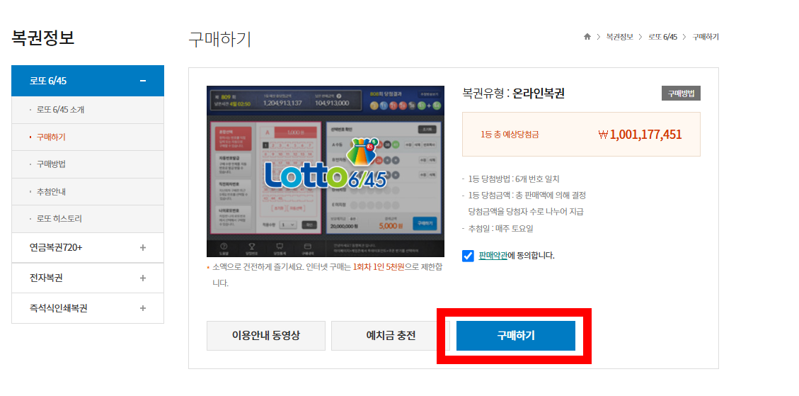 아래의 화면에서 빨간색 네모를 선택 후 적용수량 확인 후 구매하기를 누르면 복권 번호를 확인할 수 있습니다.