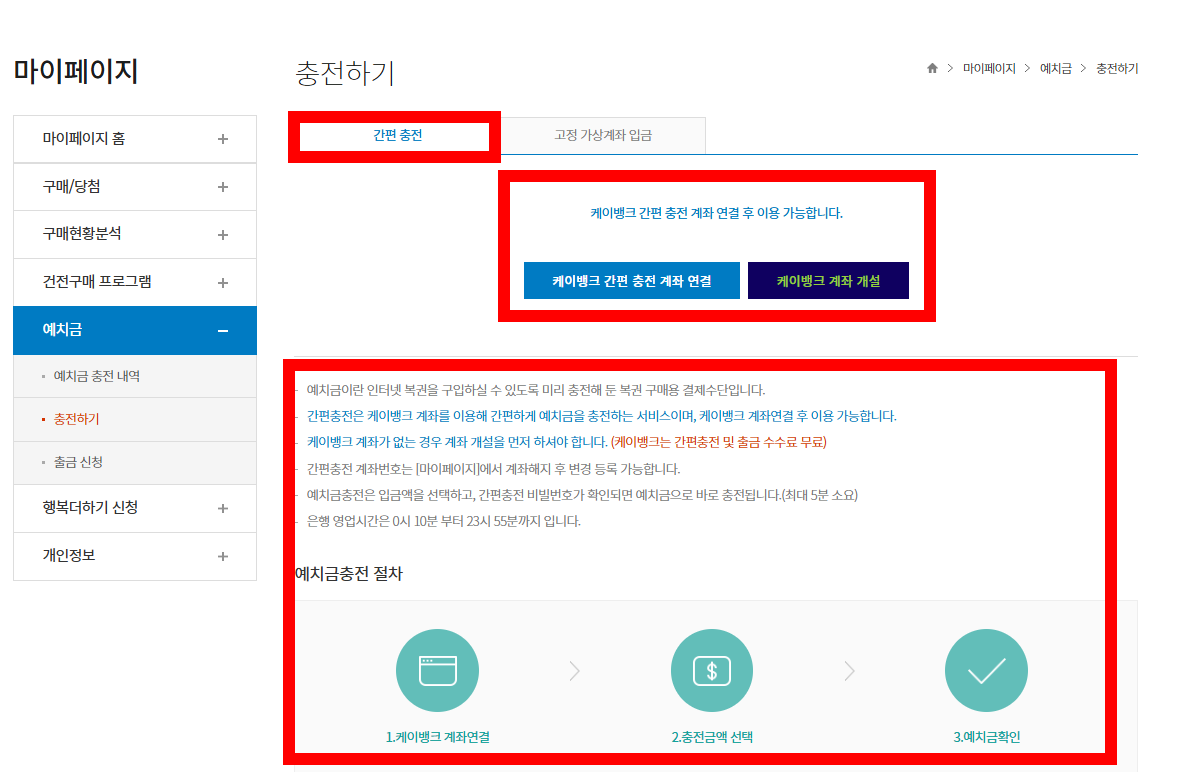 간편 충전은 케이뱅크 계좌를 개설하여 계좌 연결 후 예치금(복권을 구매하는 금액)을 충전하는 방법입니다.