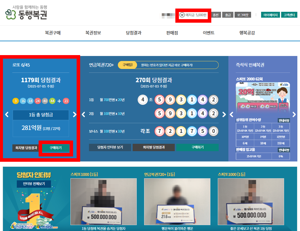 여기서 예치금이란 복권을 구입할 때 쓰기 위해 미리 충전해 두는 금액을 말합니다.