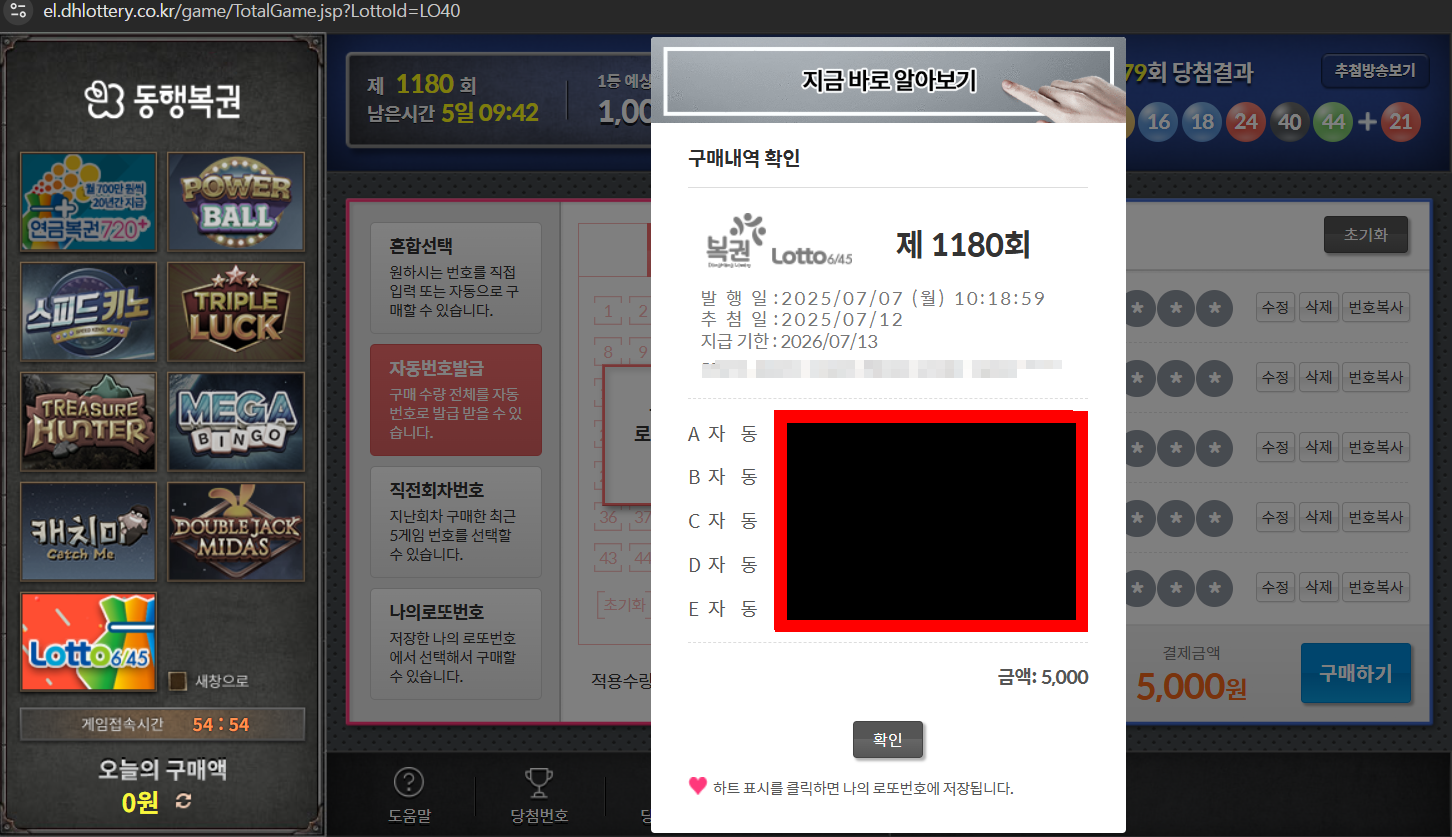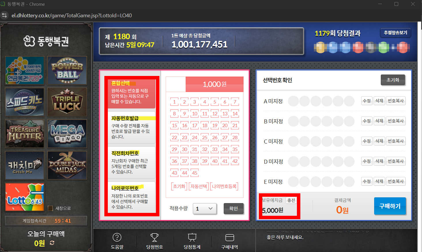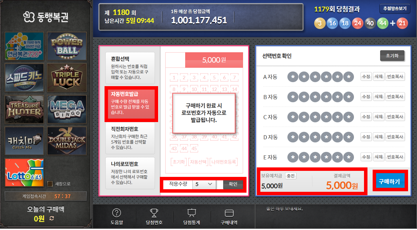 저는 자동번호발급, 적용수량 5개(5000원)를 선택해서 구매해 보겠습니다
