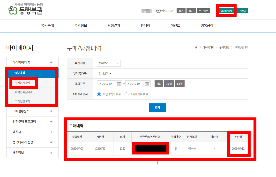 당첨확인은 매주 토요일 오후 8시 35분 이후 마이페이지의 구매당첨내역에서 확인가능합니다.