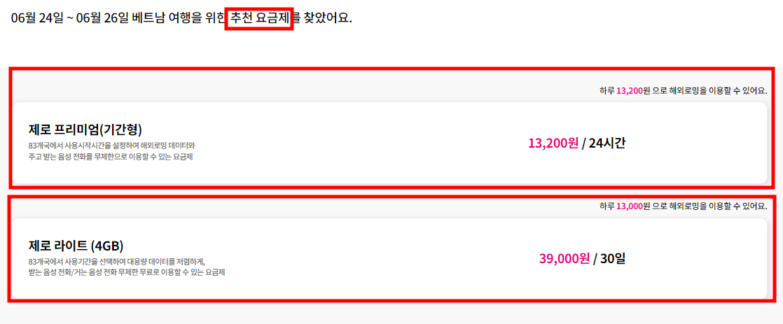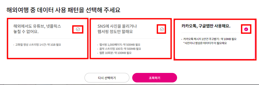 4. 원하는 날짜와 데이터 사용 패턴을 선택하면 추천요금제가 나옵니다.