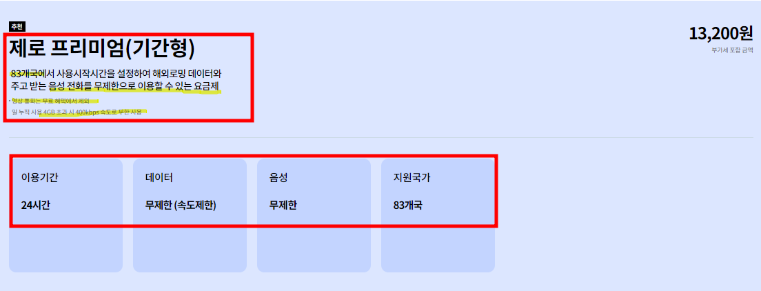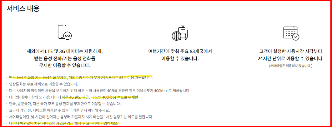 83개국에서 사용 가능하고, 24시간에 4GB를 제공하고 모두 사용 시 400 kbps 속도로 무한 사용 가능하다고 합니다.
