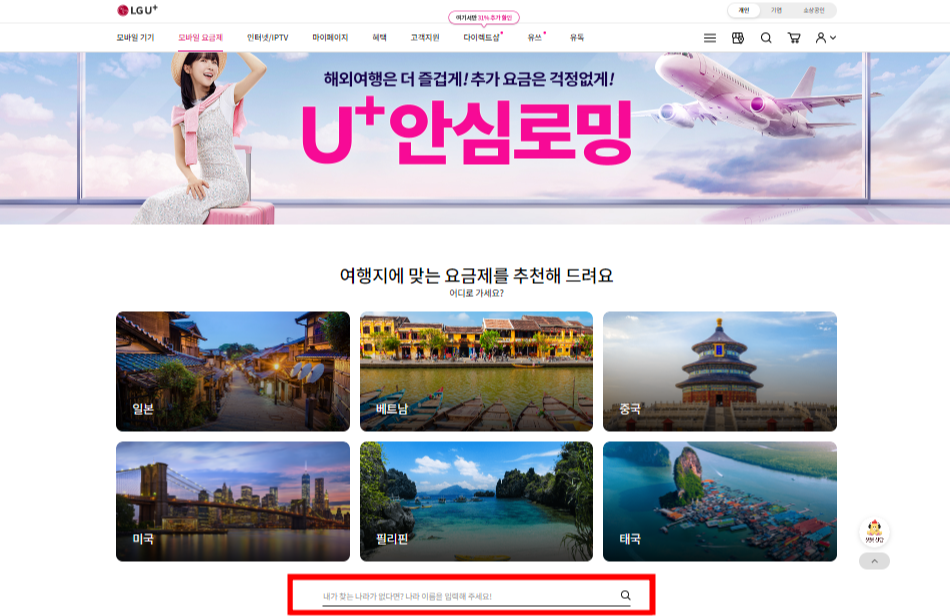 1. LG 유플러스 로밍 홈페이지에서 방문할 나라를 검색합니다.